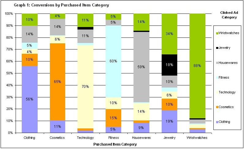 A retailer basing his advertising spend on sales alone would potentially, as a response to successful sales in the Jewelry category, increase Jewelry advertising spend at the expense of categories that saw fewer conversions, such as "Clothing." However, this move can potentially hurt Jewelry performance because Clothing advertisements actually produced 19.16% of the Jewelry conversions while Jewelry ads only produced 17.91% of Jewelry conversions, a trend shown in Graph 1 and Graph 2 above.