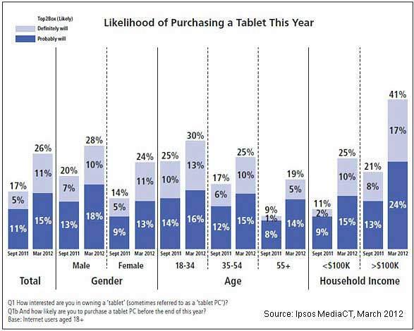 The most robust growth in tablet adoption is expected among those age 18-34 (16% will likely buy a tablet in by the end of 2012, and 13% will definitively do so) and those with annual household incomes of $100K and higher (24% will likely buy a tablet by the end of the year, and 17% will definitively do so).